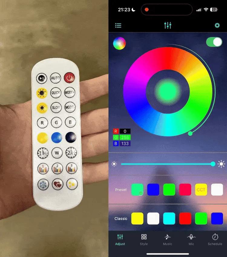 Uygulamayı indirmek için kumandanın arkasında bulunan QR kodunu taramanız yeterli. Uygulamayı yükledikten sonra, Bluetooth aracılığıyla matlarınıza bağlayın ve renkleri ve modları isteğinize göre özelleştirmeye başlayın.